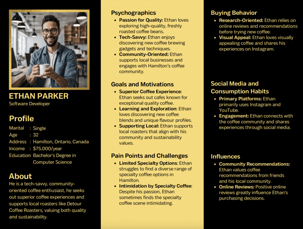 - Built a persona representing a health-conscious, values-driven coffee drinker.