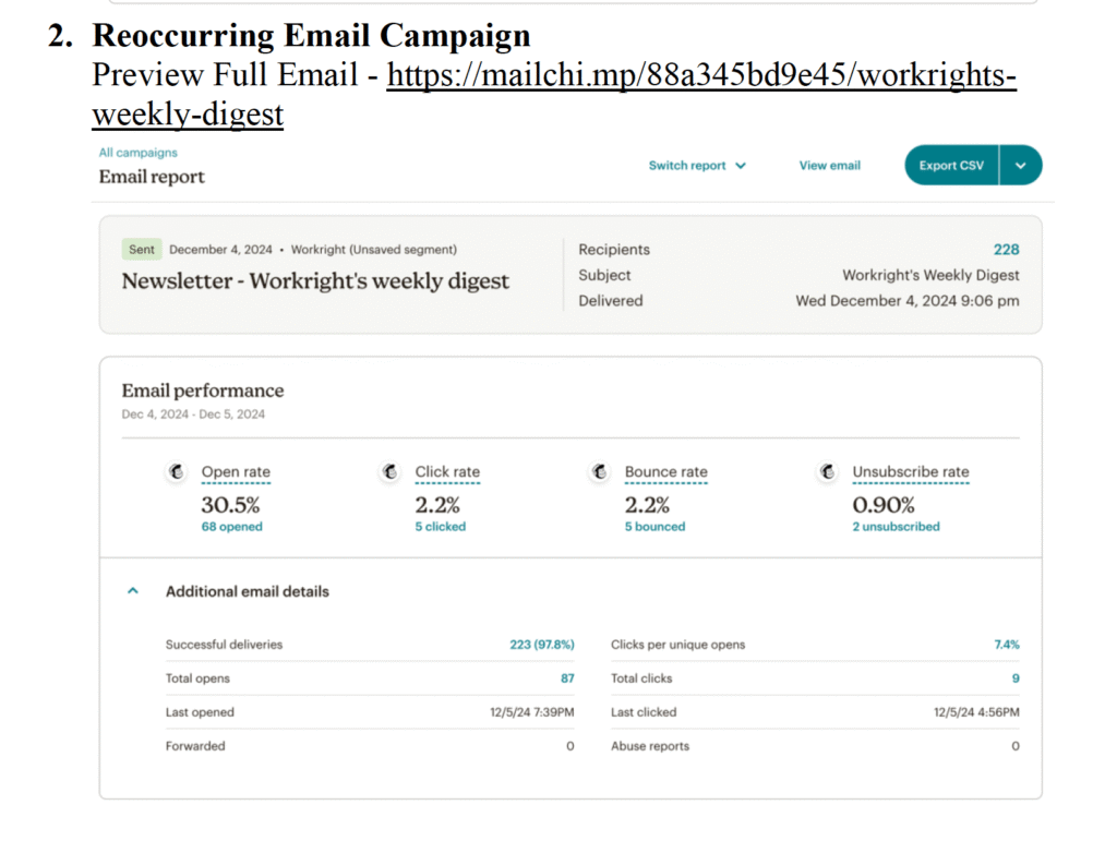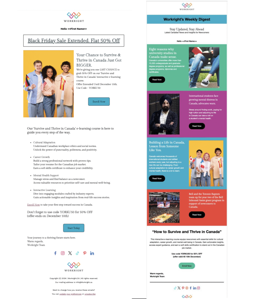 Goal – Generate Leads. - Recurring Email Campaign (Inbound) Rationale – I chose a recurring email campaign for deployment to promote the Workright course to international students and newcomers. The plan is to send a weekly newsletter featuring the latest news targeting international students, the latest blog by Workright, and the latest course updates.